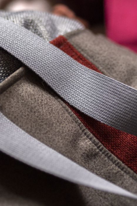 Workoplecak posiada regulowane, bawełniane paski grubości 3cm w kolorze szarym.