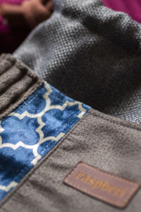 Wykonany z tkaniny o widocznym splocie w kolorze ciemnoszarym. Z przodu oraz z na tyle torebki kieszenie (np. na telefon czy chusteczki) z kilku rodzajów tkanin tworzących wspólnie ciekawą wizualnie całość.