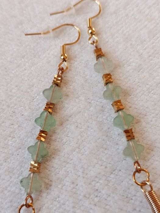 Eleganckie, lekkie, ciemnozielone kolczyki z płatków szyfonowych, ozdobione 4 małymi koralikami w kolorze miętowym oraz 4 kosteczkami rzeźbionymi ze złotego metalu. Kolczyki zakończone są biglami ze stali szlachetnej. Całkowita długość kolczyka to 13 cm.