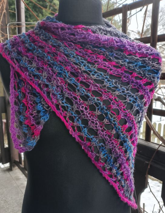 Nieduża cieniowana chusta wykonana w całości ręcznie na drutach z miłej w dotyku włóczki akrylowej. Ażurowy wzór sprawia, że chusta jest lekka, rozciągliwa, a przy tym ciepła. Doda uroku każdej stylizacji.
