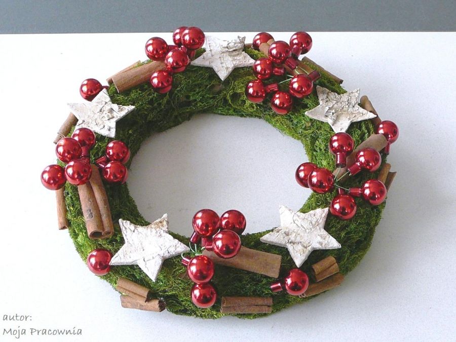 Utrzymany w świątecznej, czerwono-zielono-kremowej kolorystyce, wianek z gwiazdkami z kory, cynamonem i bombkami. Do postawienia na stole, meblach, kominku itd. lub do powieszenia.