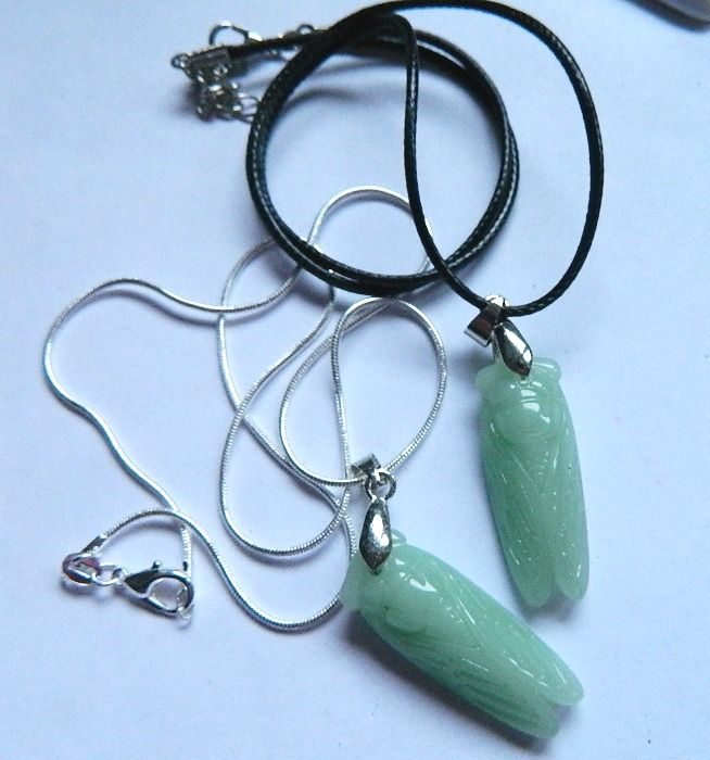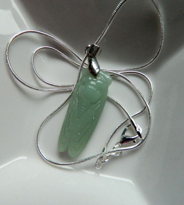W kamieniu wyrzeźbiono cykadę. Wisiorek ma dwie różne strony dlatego zastosowana została symetryczna krawatka. Wisiorek jest delikatny, idealny dla miłośników niewielkiej ale oryginalnej biżuterii.