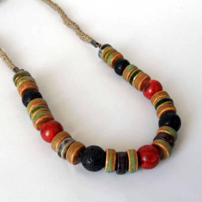 Naszyjnik wykonany z ceramicznych dropsów (15mm) , które poszkliwiłam zielenią z dodatkiem brązu, kul lawy wulkanicznej 16mm i kul korala czerwonego (16mm). Wszystko to zawiesiłam na uplecionym przeze mnie sznurku lnianym. Długość naszyjnika wynosi 60cm, lecz może zostać zmieniona według życzenia. Wykończenie ze srebra pr.925.