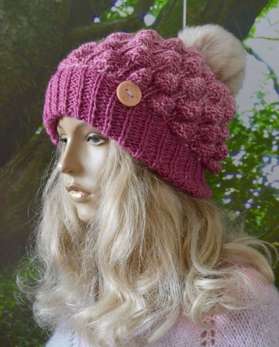 Czapka wykonana ręcznie z włóczki o składzie 75% akryl / 15% poliamid / 10% wełna w kolorze ciemny różowy.