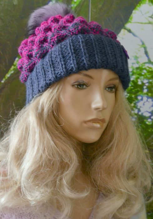 Czapka wykonana ręcznie z włóczki o składzie 75% akryl / 15% poliamid / 10% wełna w kolorze granatowy i fuksja.