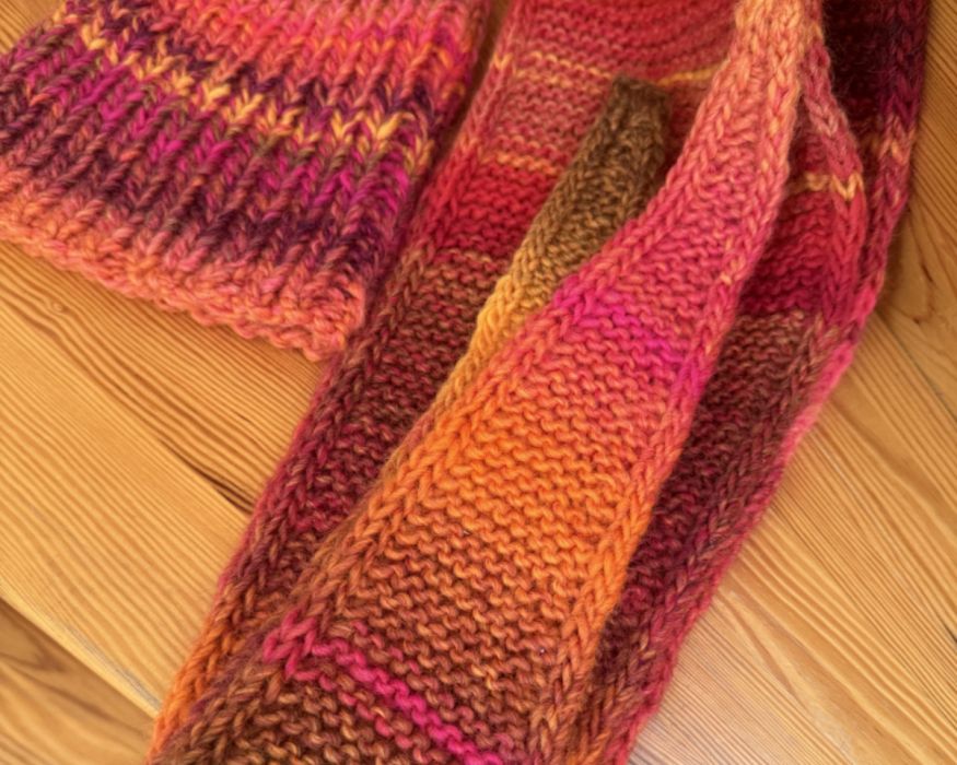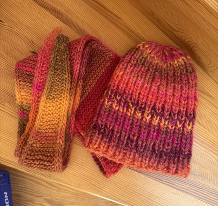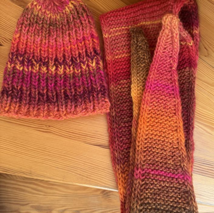 Czapka i trójkątny szalik w ślicznych energetycznych kolorach. Robione ręcznie na drutach z mieszanki wełny i akrylu. Ciepłe i bardzo milutkie dla skóry. Komplet będzie stanowił doskonały dodatek do codziennej stylizacji. Do wykorzystania zimą jak i jesienią.