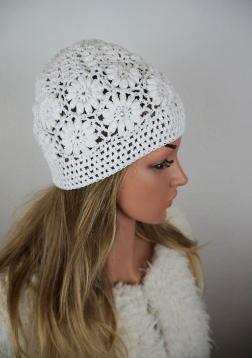 Czapkę wykonano ręcznie szydełkiem, bawełna - 70%, wiskoza - 30%. Wymiary czapki; głębokość - ok. 20 cm, szer. dołu - ok. 54, 58 cm. Czapka doskonale dopasowuje się do głowy. Proszę prać ręcznie, suszyć w stanie rozłożonym.