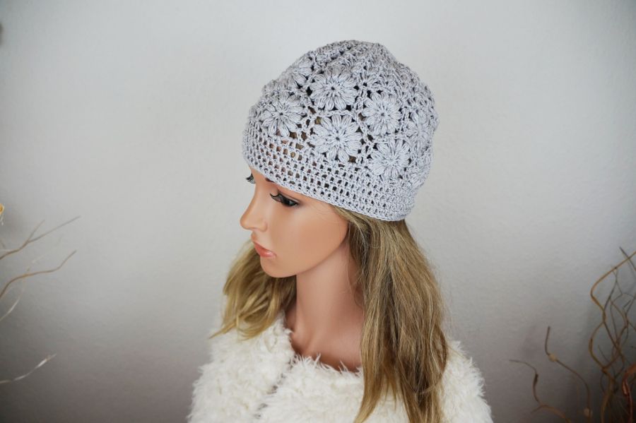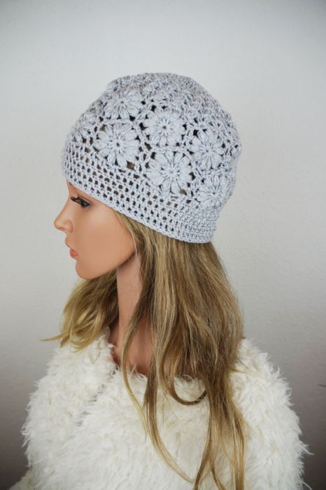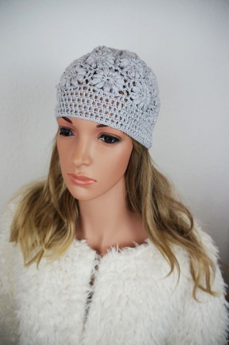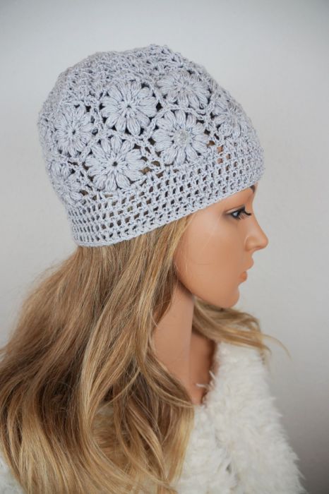 Czapkę wykonano ręcznie szydełkiem, bawełna - 70%, wiskoza - 30%. Wymiary czapki; głębokość - ok. 20 cm, szer. dołu - ok. 54, 58 cm. Czapka doskonale dopasowuje się do głowy. Proszę prać ręcznie, suszyć w stanie rozłożonym.
