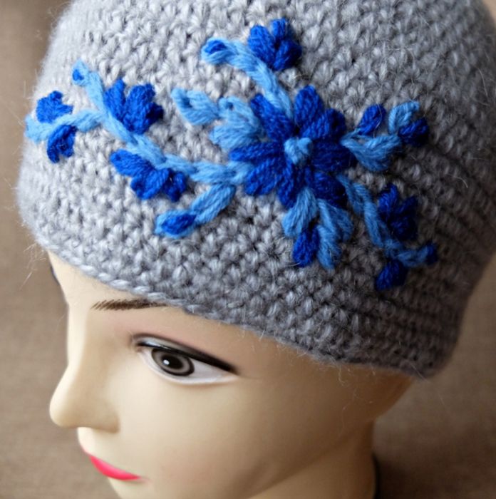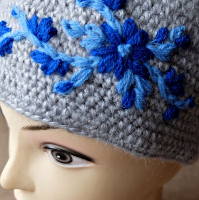Dekoracją są kwiaty wyszywane ręcznie z włóczki akrylowej w kolorach niebieskim jasnym i ciemnym. Może też sprawić przyjemność obdarowanej osobie.