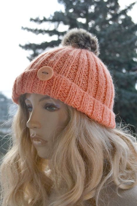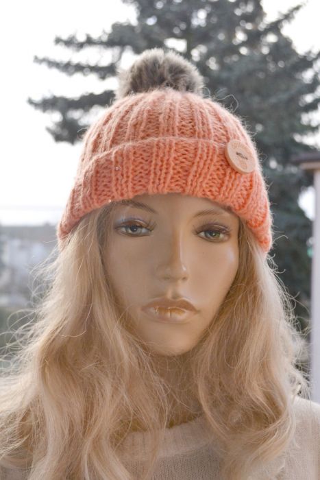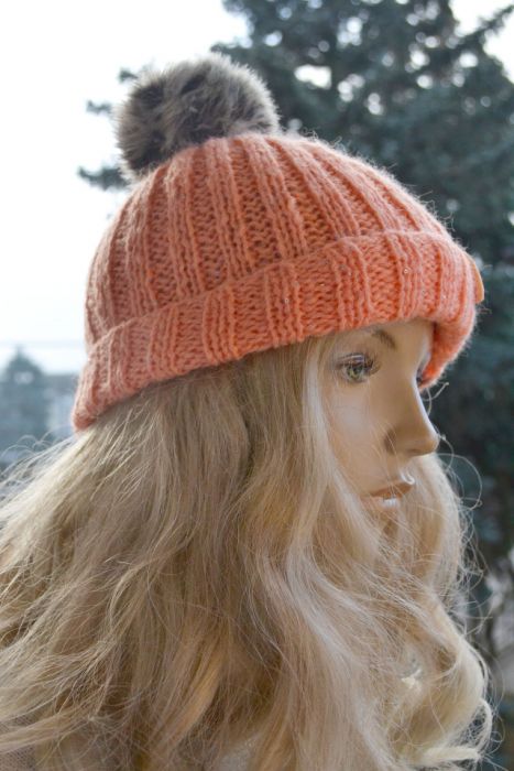 Czapka wykonana ręcznie na drutach z dwóch włóczek o składzie 100% wełna, 5% metaliczna nić, 5% cekiny-10% poliester 80% akryl , w kolorze łososiowym z maleńkimi cekinami .