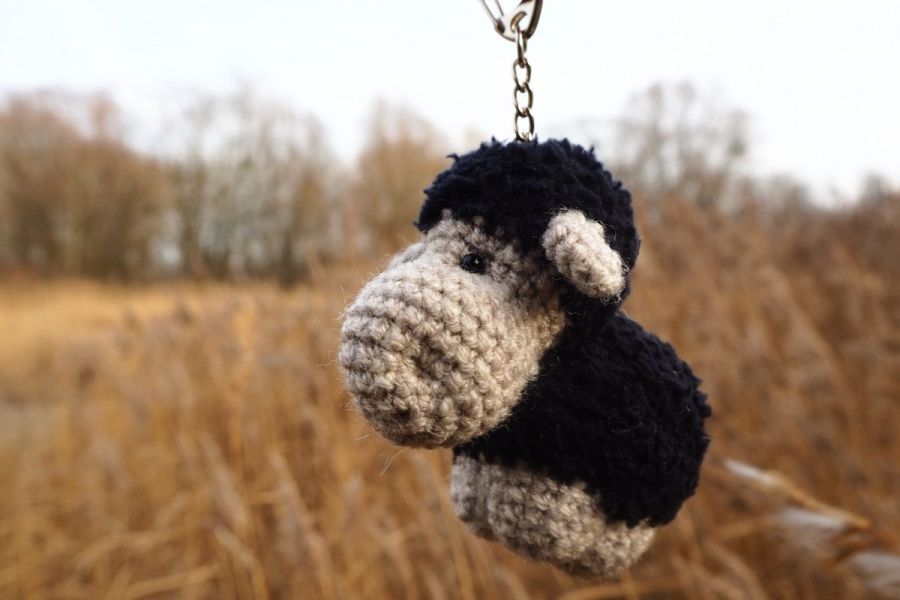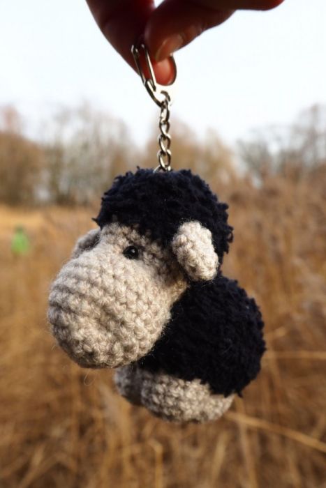 Sympatyczny brelok owieczka wykonany ręcznie z fantazyjnej włóczki na szydełku.