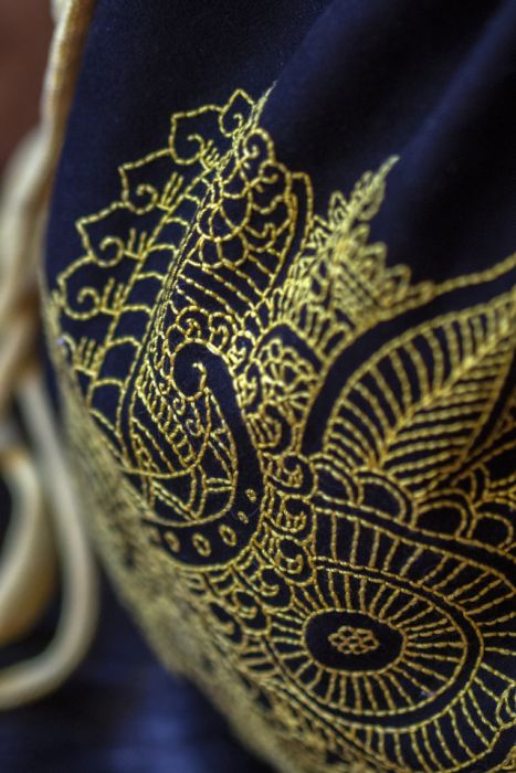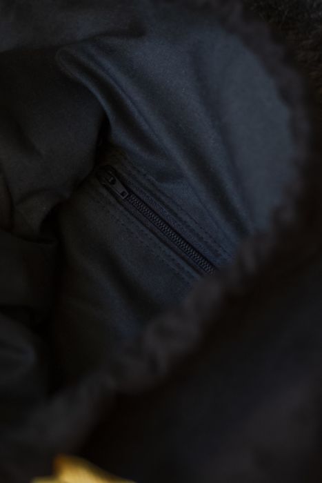 Plecak worek wykonany z nubuku w kolorze czarnym. Z przodu ręcznie haftowany, żółty wzór.
