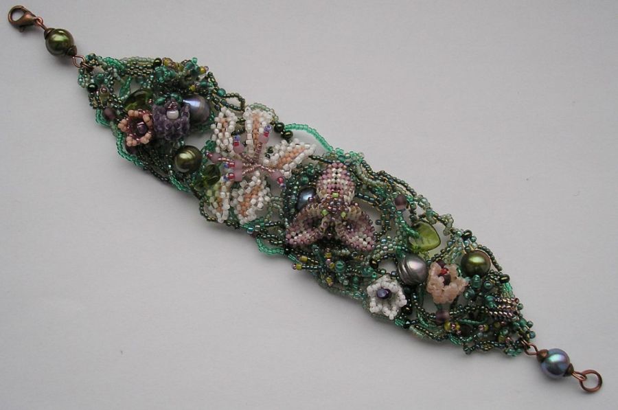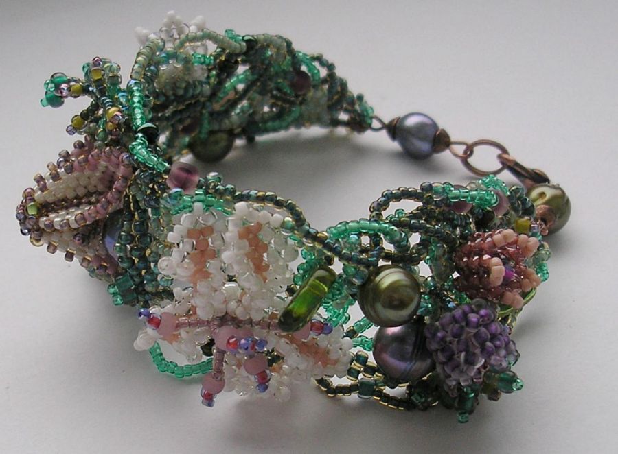 Bransoleta ręcznie wypleciona z japońskich koralików Toho i pereł słodkowodnych. Wykonana bardzo dokładnie i solidnie, z dbałością o szczegóły - efekt kilkunastu godzin pracy. Śliczna, niepowtarzalna i bardzo romantyczna... pasuje do letniej sukienki, jesiennego sweterka, a nawet do sukni ślubnej dla niekonwencjonalnej Panny Młodej :)