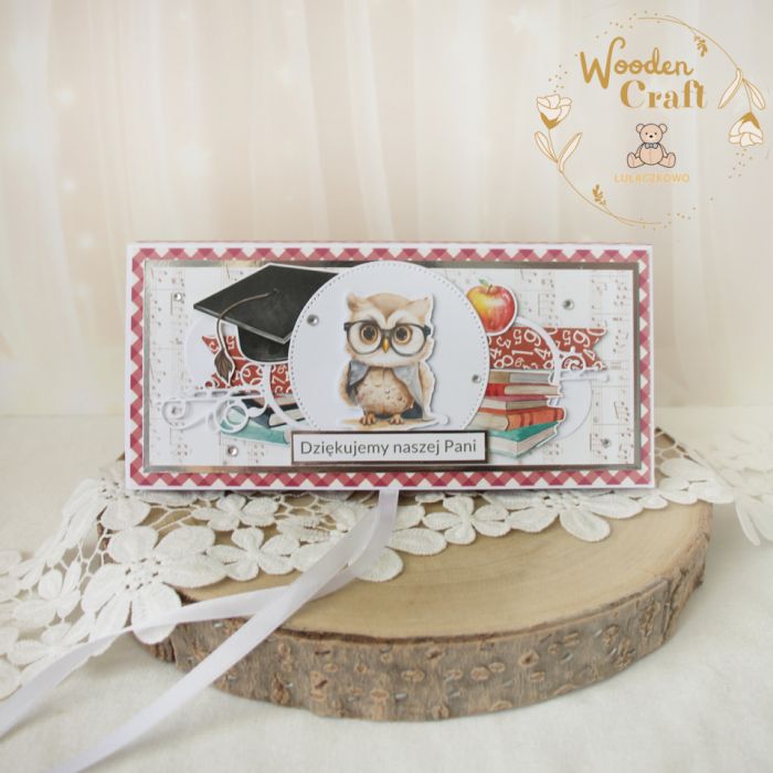 Czekoladownik z motywem sowy i przyborów szkolnych, został wykonany z grubego kartonu o gramaturze 300g, ozdobiony papierami scrapowymi w kolorze czerwieni i beżu, wiązany na wstążeczkę. Na wierzchu napis "Dziękujemy Naszej Pani" - mogę również zmienić na inny.