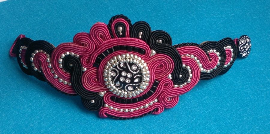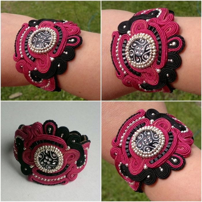 Piękna, efektowna bransoletka w harmonicznym połączeniu soczystego odcieniu fuksji i czarnego została wykonana ręcznie pracochłonną techniką haftu sutasz.