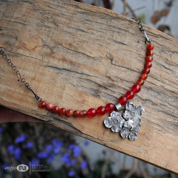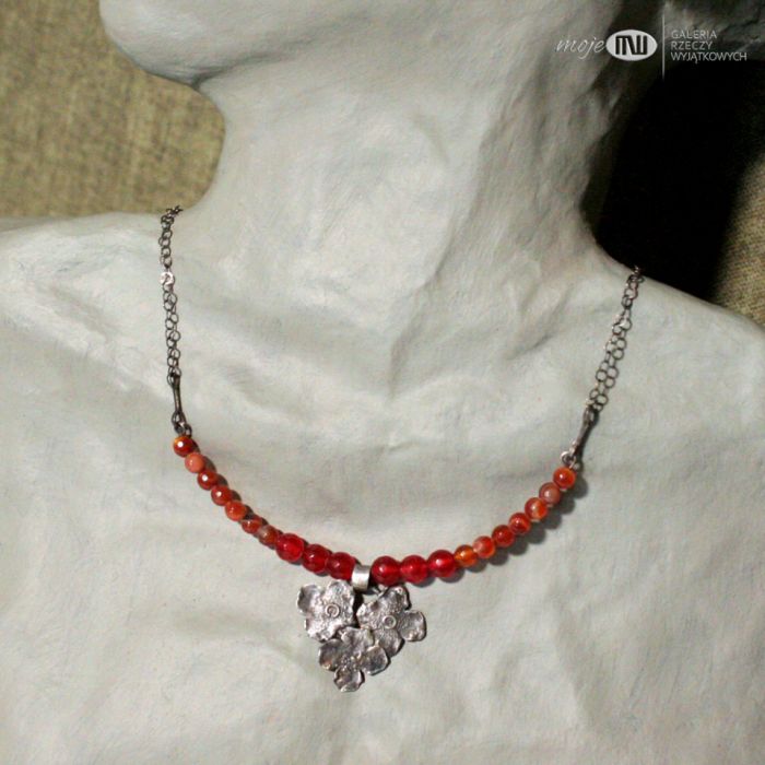 Naszyjnik ze srebra i czerwonych kamieni w różnych odcieniach. Element z ręcznie formowanego srebra z wizerunkiem stylizowanych kwiatów, który okalają fasetowane kamienie - większe to jadeit 8 mm, mniejsze to agat 5 mm w odcieniu cynobrowym. Zawieszony na srebrnym łańcuszku z okrągłymi ogniwami.