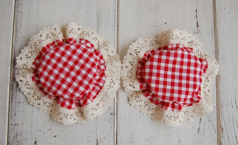 Dekoracyjne kapturki na słoiki z przetworami. Uszyte z tkaniny w krateczkę typu vichy, dookoła wykończone koronką bawełnianą. Od lewej strony wszyta gumka - ułatwiająca zdejmowanie i wkładanie kapturka na słoik. Pasują na zakrętkę o średnicy 5,5/6,5cm.