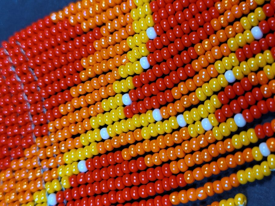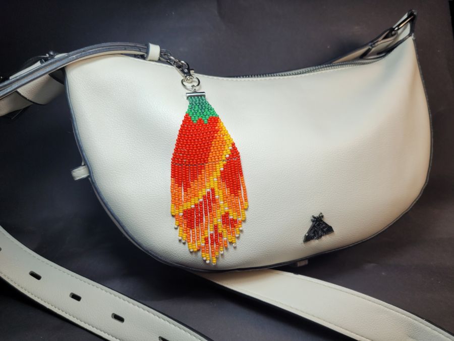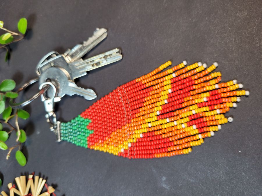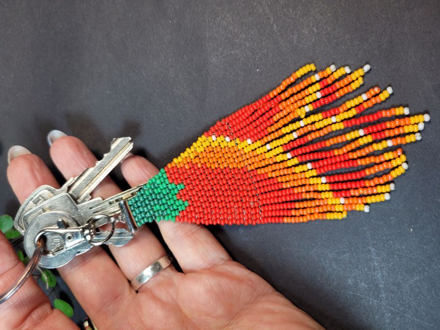Ręcznie wykonana brelok - zawieszka "Czerwony Kwiat" chwost z drobnych czeskich koralików Preciosa. Intensywna kolorystyka różnych odcieni czerwonego, pomarańczowego, żółtego.