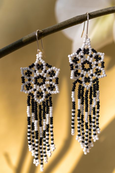 Charakterystyczne, ręcznie robione kolczyki wykonane są z wysokiej jakości czeskich koralików Preciosa w kolorze czarno-białym. Styl boho chic to prawdziwa esencja wolności, naturalnego piękna i artystycznej ekspresji. Kompozycja inspirowana motywem florystycznym. Kolczyki są lekkie i zarazem wyraziste. Wydłużają szyję oraz wyróżniają Twoją stylizację.