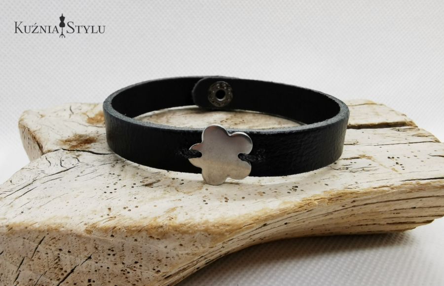 Bransoletka z naturalnej skóry w kolorze czarnym. Główną ozdobą jest przekładka ze stli szlachetnej w kształcie kwiatka. Kwiatek jest przyszyty do bransoletki. Zapięcie typu nap - zatrzask w kolorze czarnym, bardzo łatwe zapinanie.