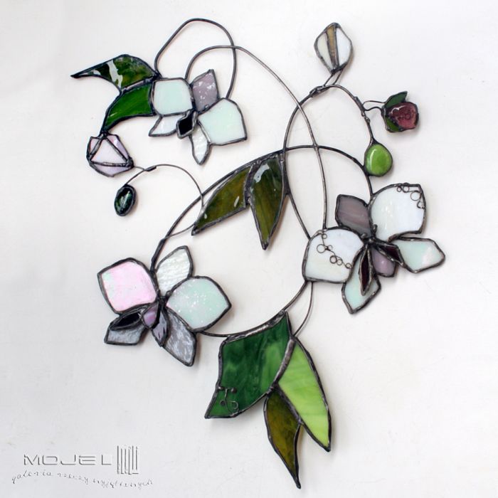 Dekor wiszący ze szkła witrażowego z wizerunkiem stylizowanych kwiatów i pąków storczyka. Szkło jest w odcieniach bieli z opalizującą powłoką, szarego różu i zieleni. Dekor wykończony jest miedzią pokrytą cyną, patynowaną i przecieraną.