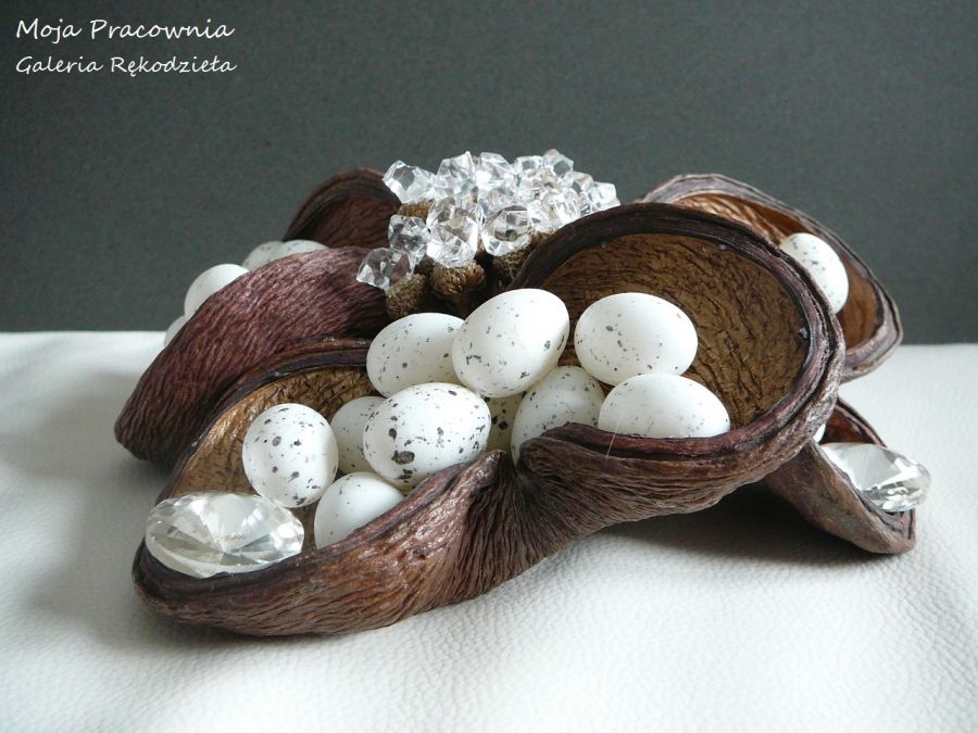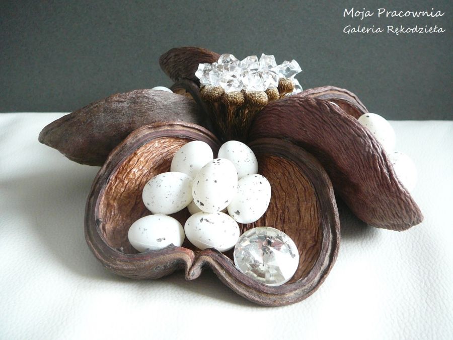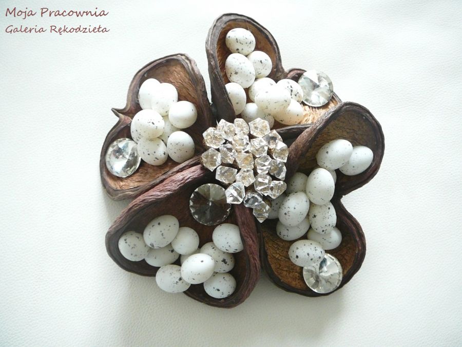 Wielkanocna dekoracja o niestandardowym kształcie, przypominającym czterolistną koniczynę. Wnętrze każdego "płatka" wypełniają sztuczne pisanki i diamenty. W centralnej części znajduje się susz egzotyczny zwieńczony kilkunastoma przeźroczystymi kryształkami. Całość utrzymana w brązowo-białej kolorystyce.