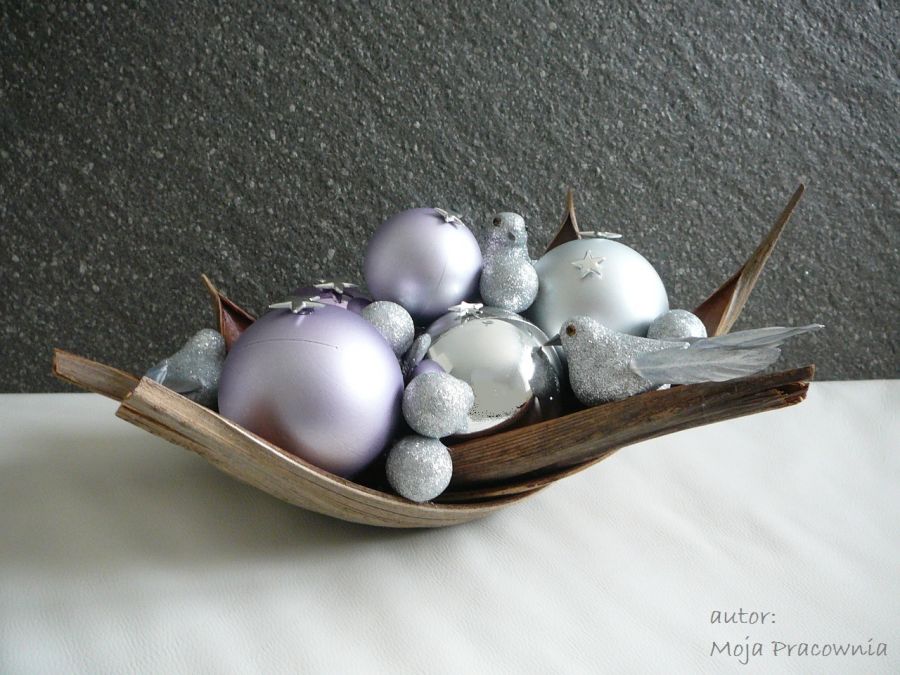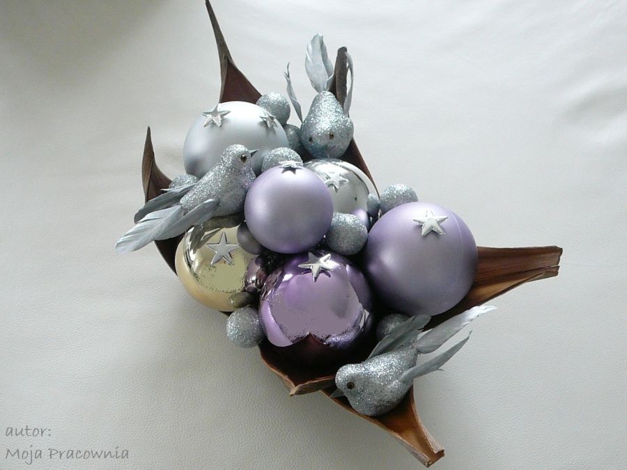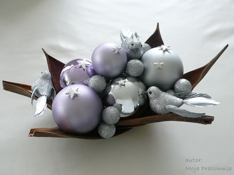 Świąteczna dekoracja z bombkami, gwiazdkami i sztucznymi ptakami, w srebrno-liliowo-brązowej kolorystyce.