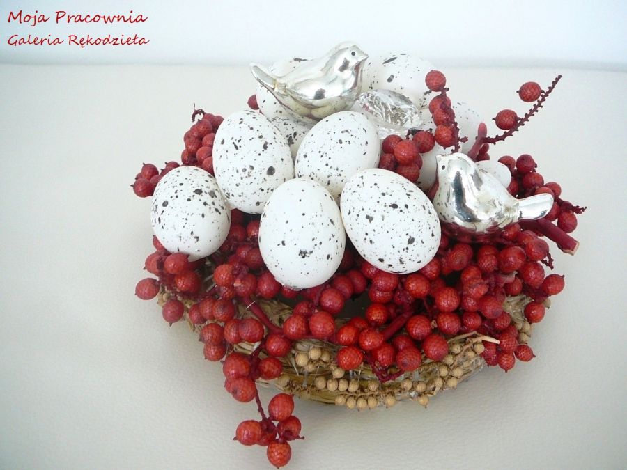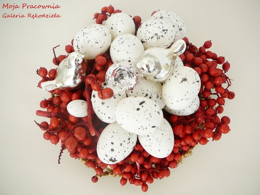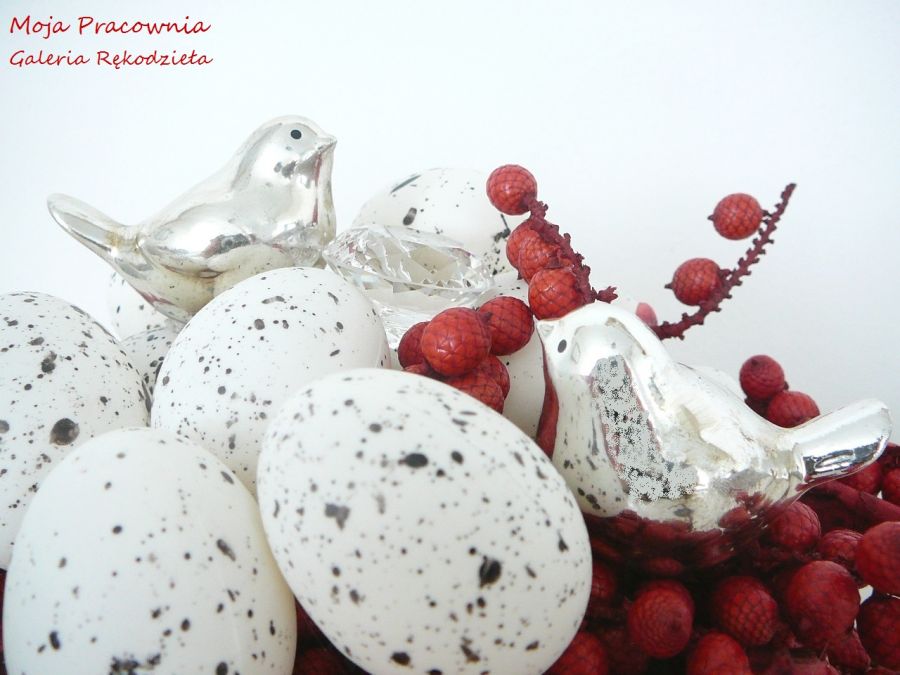 Wielkanocna dekoracja, utrzymana w czerwono-biało-kremowej kolorystyce, z kilkunastoma nakrapianymi pisankami, której głównymi "bohaterami" są dwa posrebrzane ptaki strzegące diamentu.