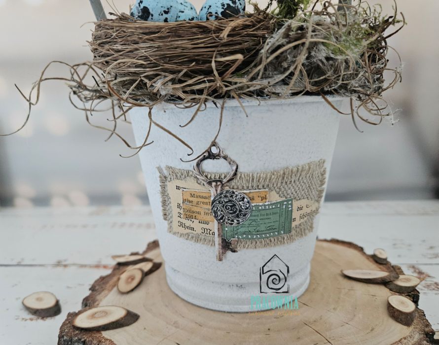 Nazwa produktu: Ozdoba Wielkanocna ,metalowa doniczka z gniazdem z suchej trawy