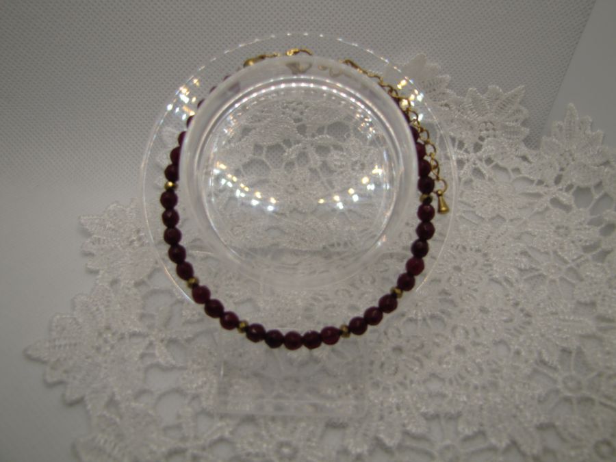 Delikatna bransoletka z fasetowanych kuleczek agatu w kolorze ciemnej wiśni, w rozmiarze 4mm. Jako przekładki użyłam małe oponki fasetowane hematytu platerowanego na złoto. Całość na lince jubilerskiej. Zapięcie ze stali szlachetnej pozłacanej. Długość bransoletki z zapięciem 18,5cm + 5cm łańcuszka.