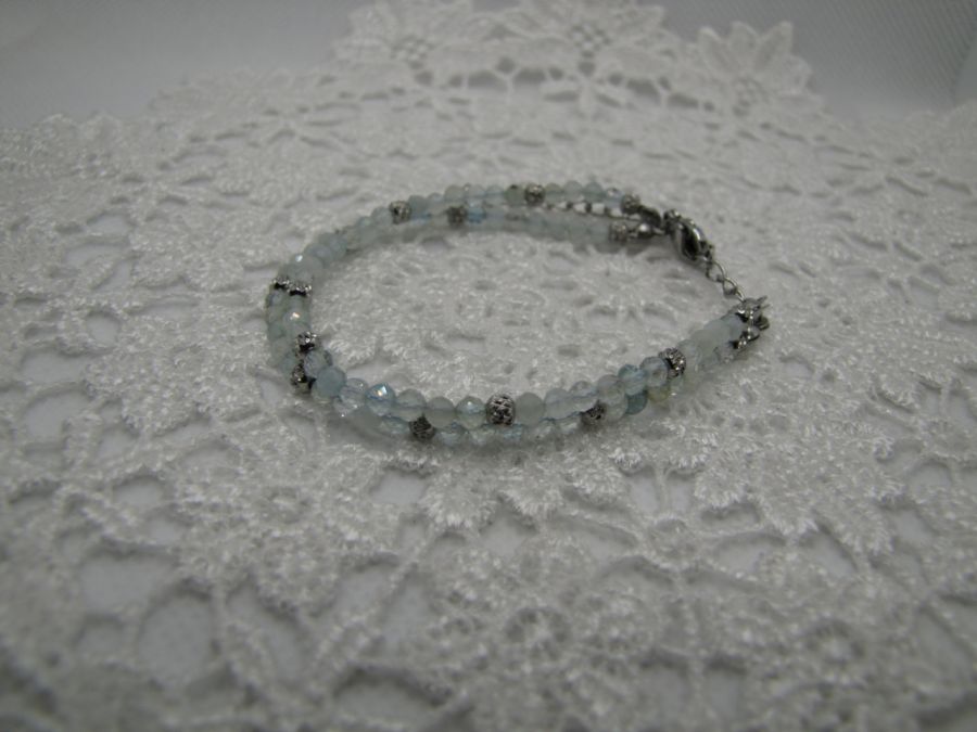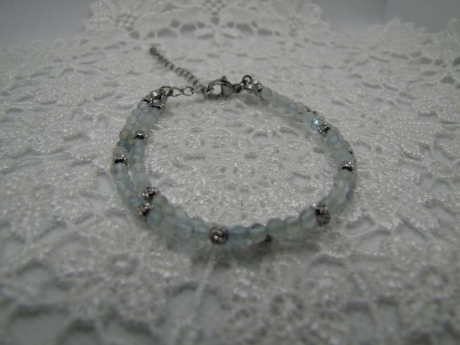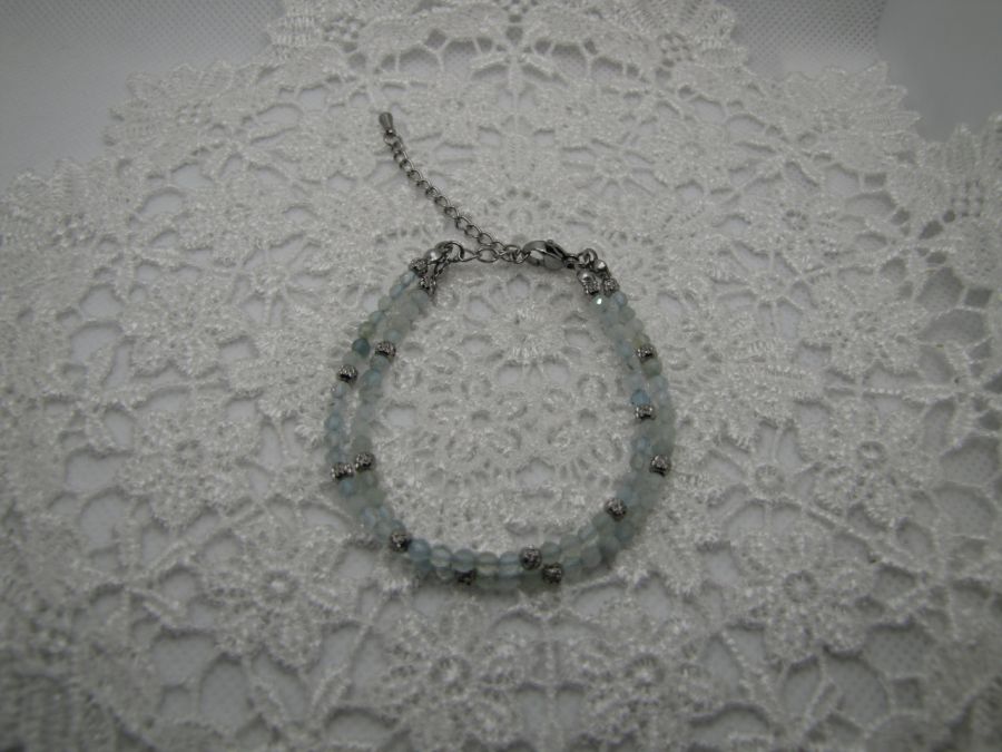 Delikatna, podwójna bransoletka z przejrzystych zielonkawych i niebieskawych, fasetowanych kuleczek 3mm Akwamarynu. Jako przekładki ozdobne kulki ze stali szlachetnej. Zapięcie karabinek także ze stali szlachetnej. Całość na lince jubilerskiej. Długość z zapięciem 15,5 cm + 5cm przedłużki. Bransoletka pięknie połyskuje w świetle.