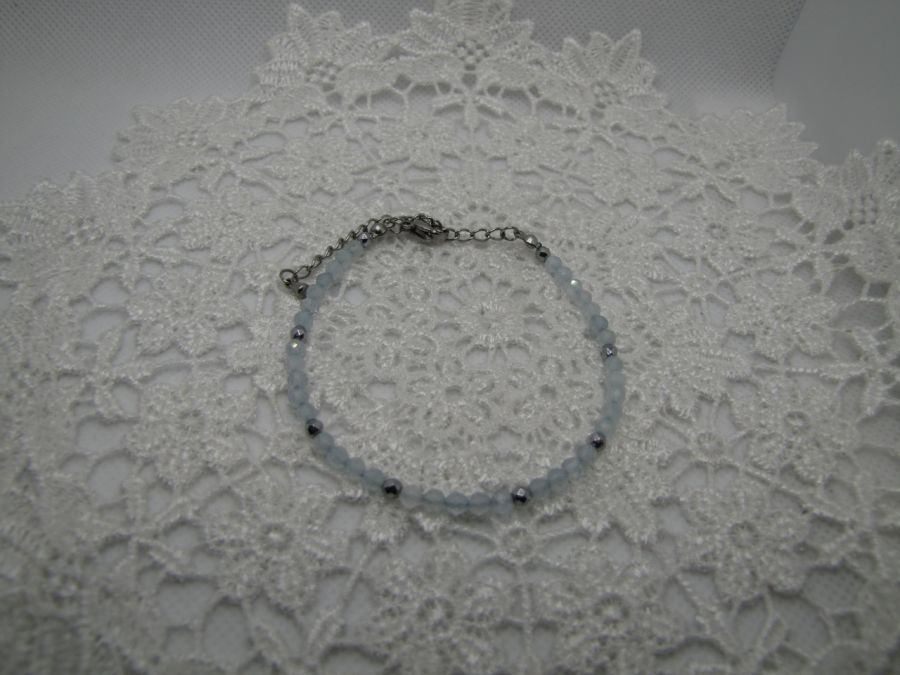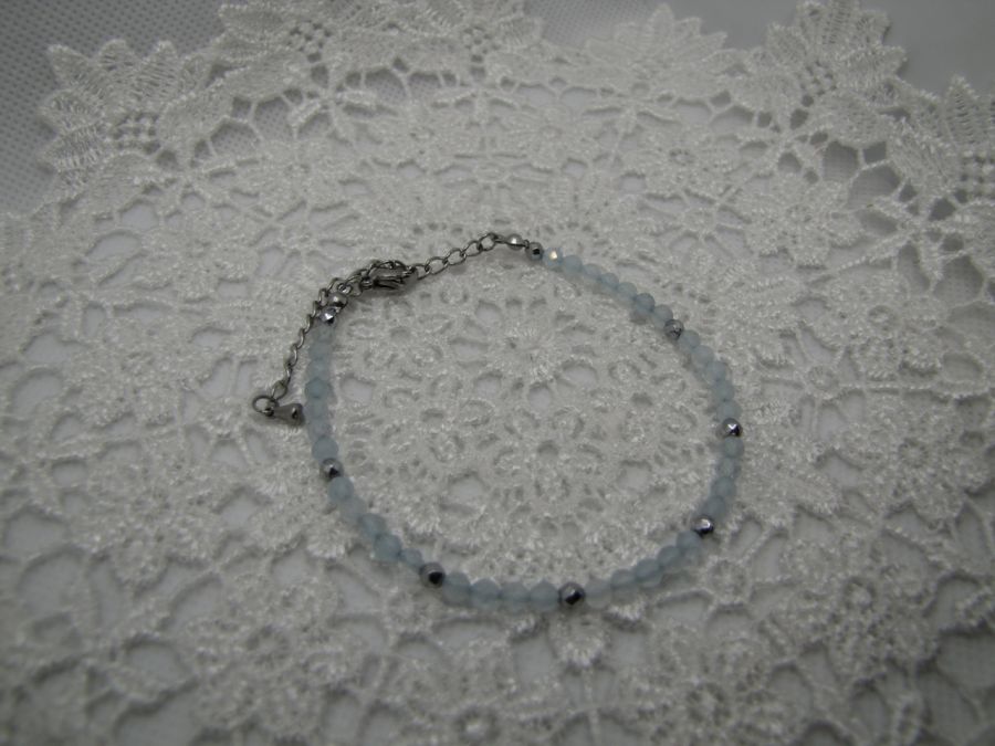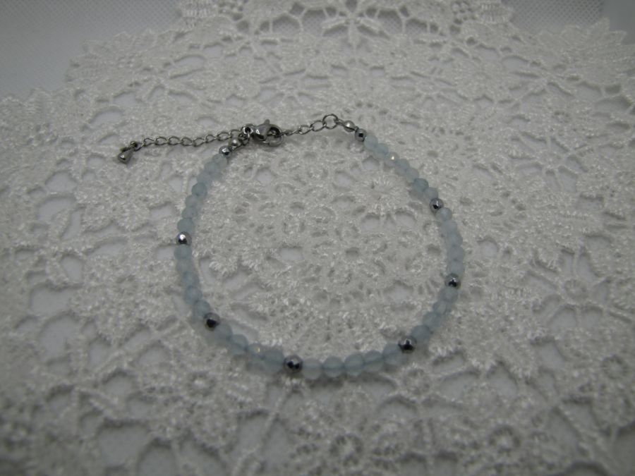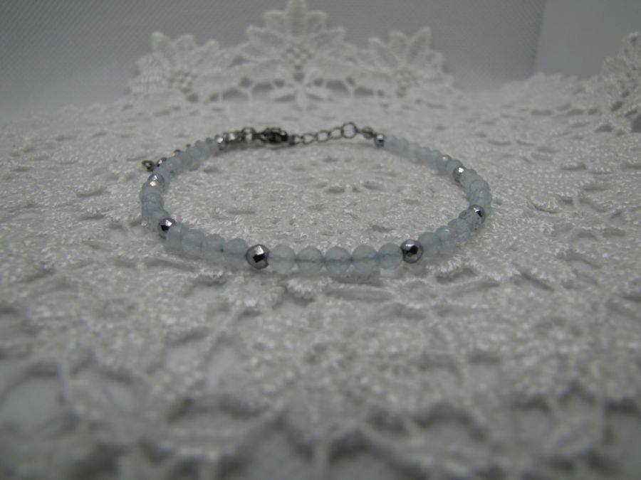 Delikatna bransoletka z fasetowanych 3mm kuleczek Akwamarynu w bladoniebieskim przejrzystym kolorze. Jako przekładki użyte platerowane na srebrno kuleczki hematytu. Zapięcie typu karabińczyk, ze stali szlachetnej. Całość na lince jubilerskiej. Długość z zapięciem 17,5cm + 5cm przedłużki.