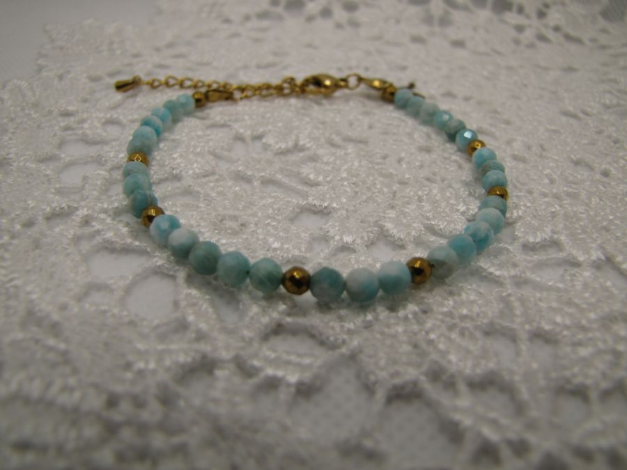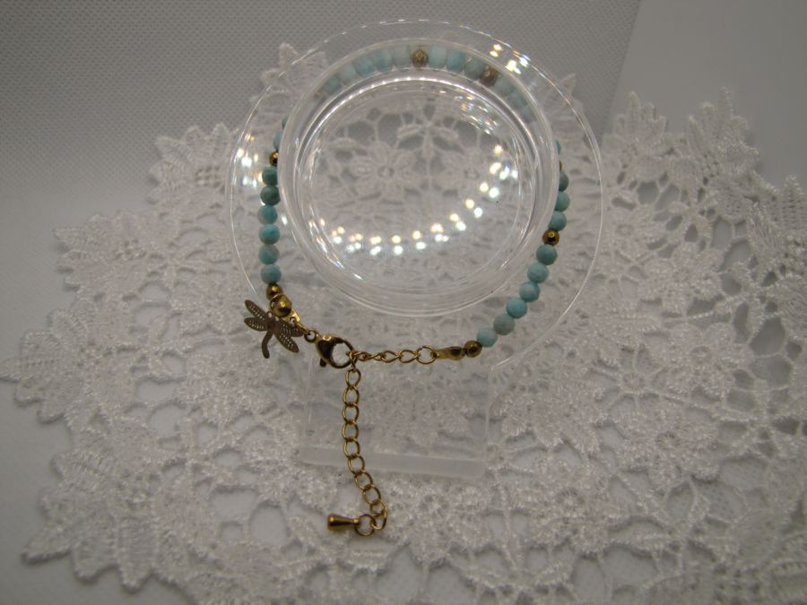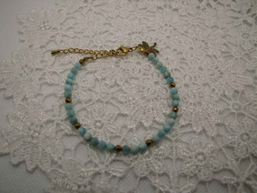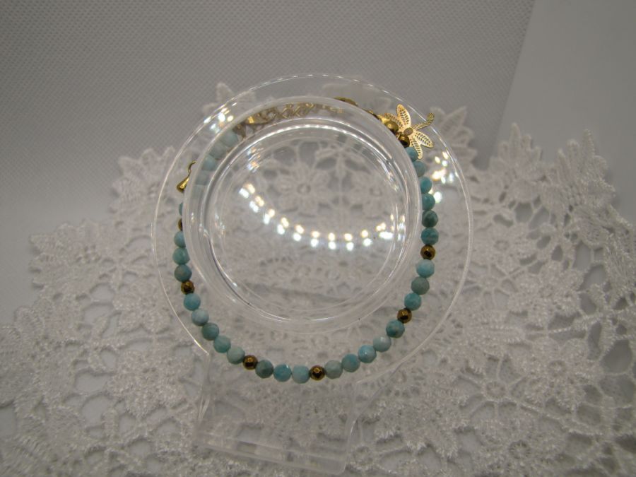 Delikatna bransoletka z fasetowanych kuleczek amazonitu w kolorze lazurowym, w rozmiarze 4mm. Jako przekładki użyłam kuleczki fasetowane hematytu platerowanego na złoto. Całość na lince jubilerskiej. Zapięcie ze stali szlachetnej pozłacanej. Dodatkowo uroku dodaje mała zawieszka ważka. Długość bransoletki z zapięciem 17cm + 5cm łańcuszka.