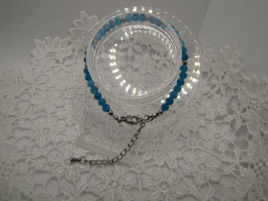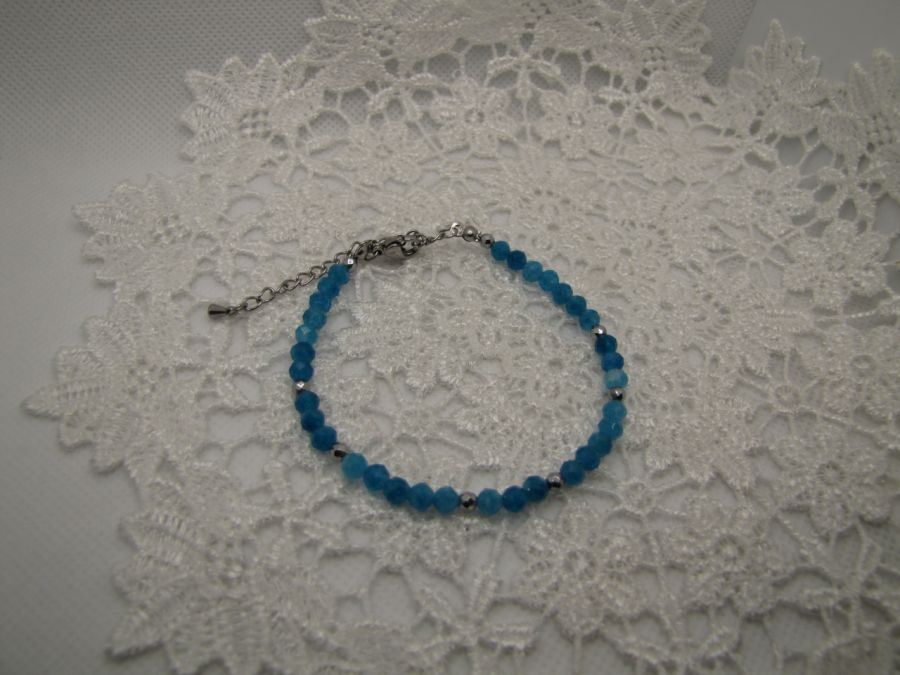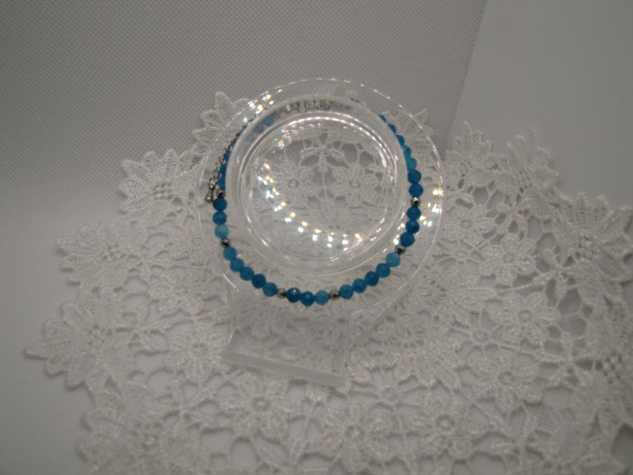 Delikatna bransoletka z fasetowanych kuleczek ciemnoniebieskiego chalcedonu w rozmiarze 4mm. Jako przekładki fasetowane kuleczki hematytu platerowanego na srebrny kolor. Całość umieszczona na lince jubilerskiej. Zapięcie ze stali szlachetnej. Długość bransoletki z zapięciem 17,5cm + 5cm łańcuszka przedłużki.