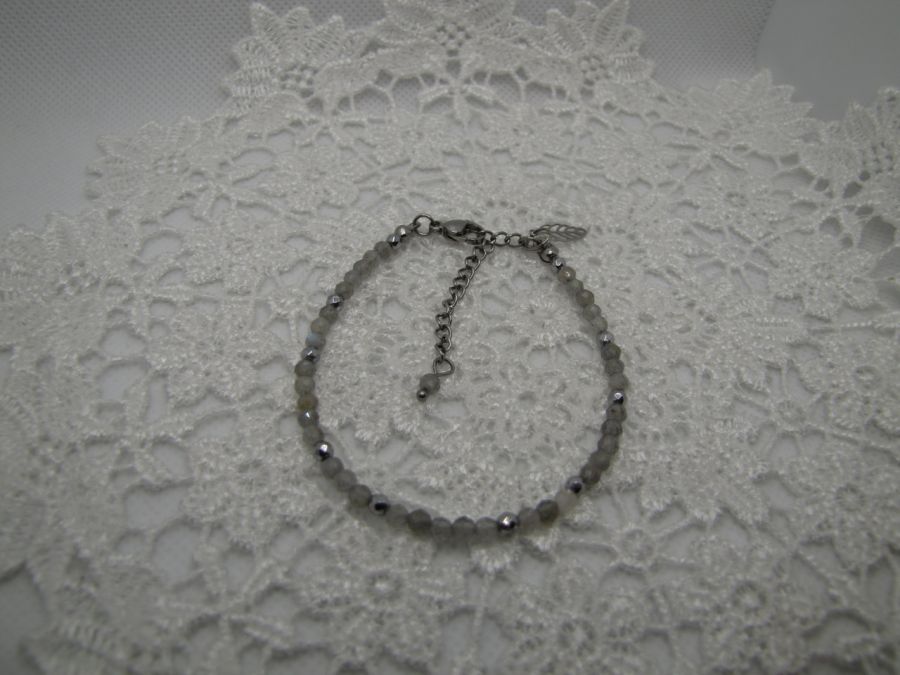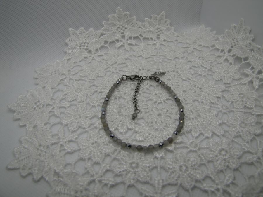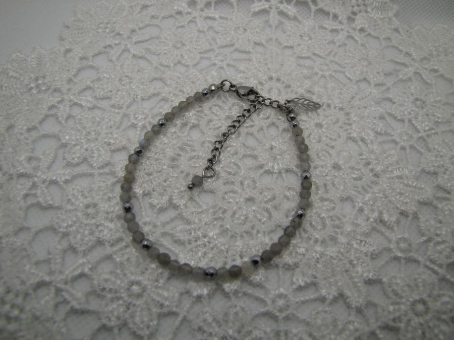 Delikatna bransoletka z fasetowanych 3mm kuleczek Labradorytu w przejrzystym szarym kolorze. Jako przekładki użyte platerowane na srebrno kuleczki hematytu. Zapięcie typu karabińczyk, ze stali szlachetnej. Całość na lince jubilerskiej. Dodatkowo mała zawieszka w kształcie listka. Długość z zapięciem 17cm + 5cm przedłużki.
