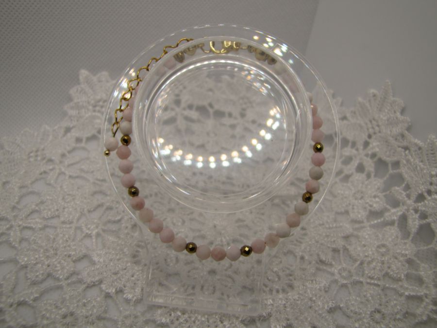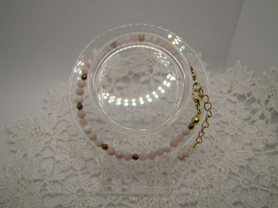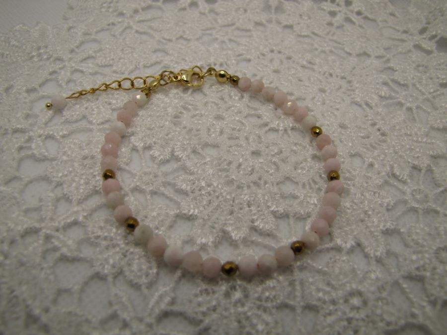 Delikatna bransoletka z fasetowanych kuleczek różowego opalu w kolorze w rozmiarze 4mm. Jako przekładki użyłam kuleczki fasetowane hematytu platerowanego na złoto. Całość na lince jubilerskiej. Zapięcie ze stali szlachetnej pozłacanej. Długość z zapięciem 19cm + 5cm łańcuszka.