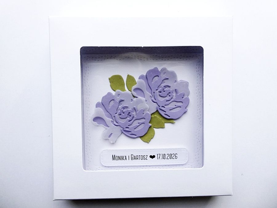 Delikatna ręcznie wykonana kartka na ślub w komplecie z ozdobnym pudełkiem z szybką - subtelna i elegancka.