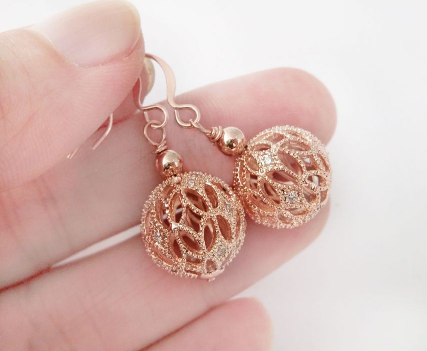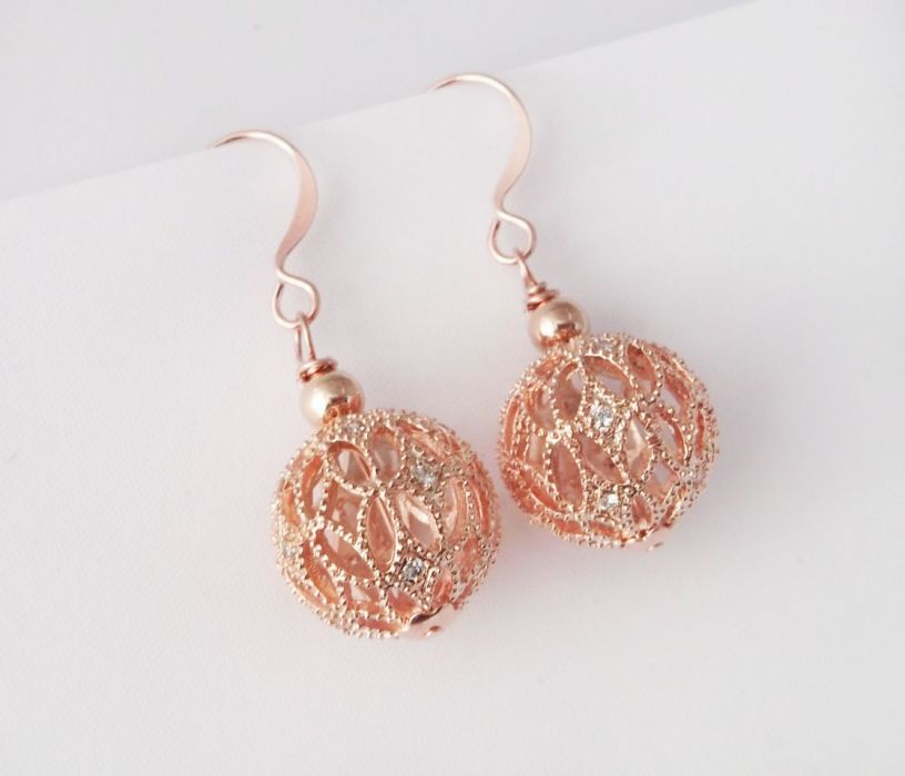 Świetne kolczyki -lekkie, klasyczne, choć jednocześnie oryginalne. Wykonane z metalu i maluteńkich jak iskierki cyrkonii umieszczonych na filigranowej formie. Metal ma kolor różowego złota.