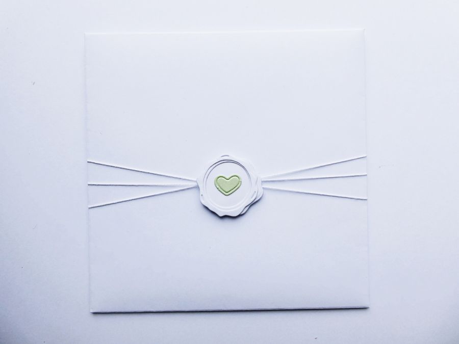 Dekoracyjny biały sznurek i papierowa pieczęć z sercem to pełne wdzięku detale, które wyróżniają kartkę spośród innych pamiątek.