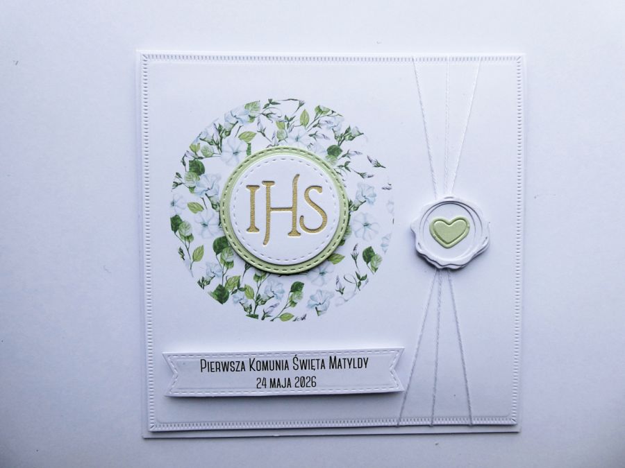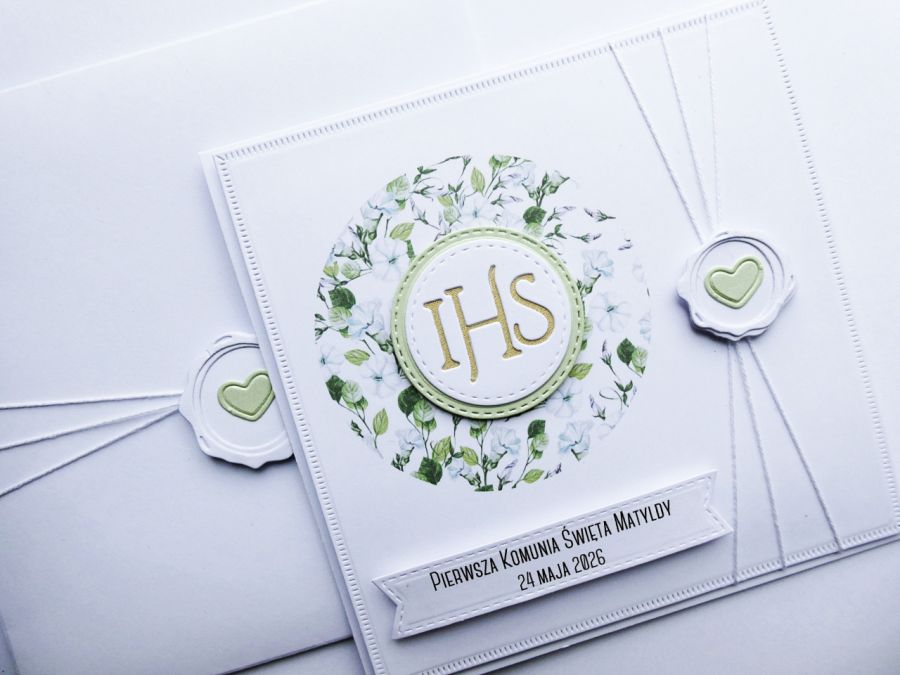 Przyozdobiona subtelną grafiką z motywem kwiatków oraz białą Hostią, która podkreśla duchowy charakter uroczystości.