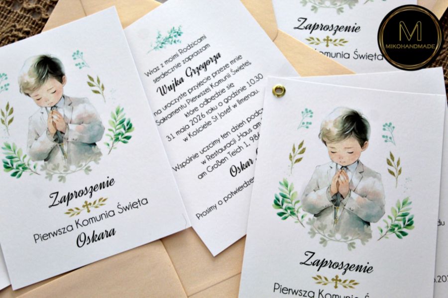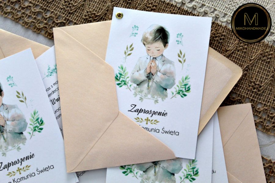 - Grafika: zaproszenie ozdobione jest wizerunkiem chłopca, odpowiednim na tę podniosłą okazję.
