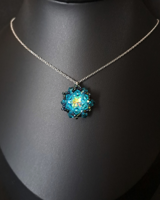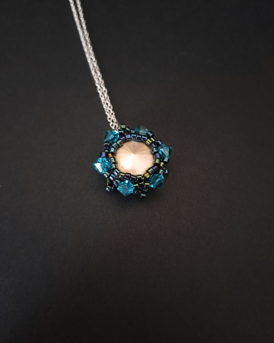 Wyobraź sobie ciepłe popołudnie, gdy promienie słońca przebijają się przez szkło witrażu - każdy krok zamienia się w taniec kolorów. Taki właśnie efekt daje turkusowy naszyjnik Crystal AB - świetlisty, zmysłowy i pełen tęczowej energii. W centrum - migoczący kamień Preciosa Rivoli Maxima 12 mm, który rozszczepia światło niczym mała galaktyka. Otulony turkusowymi kryształkami i opalizującymi koralikami tworzy zawieszkę, która zdobi szyję jak świetlisty talizman.