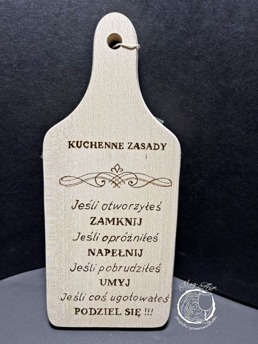 Ręcznie wypalana deska z zabawnymi kuchennymi zasadami to praktyczna i dekoracyjna ozdoba każdej kuchni. Tekst został wykonany metodą pirografii, dzięki czemu jest trwały i odporny na ścieranie.