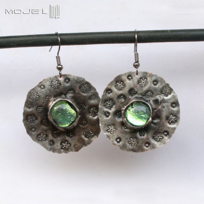 Miedziane okrągłe kolczyki ze szklanym okiem. Na okrągłej miedzianej blasze są wybite kwiatowe znaki, miedź jest pokryta cyną, patynowana i przecierana. Szkło delikatnie połyskuje w słońcu. Blaszka jest cienka, więc kolczyki są lekkie. Metalowe bigle.