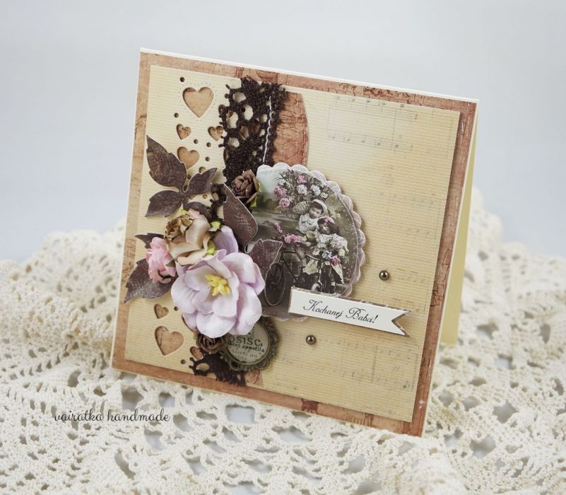 Kartka z okazji Dnia Babci, utrzymana w klimacie retro, z grafiką vintage, ozdobiona koronką, kwiatami, przeszyciami. Wielowarstwowa kompozycja.