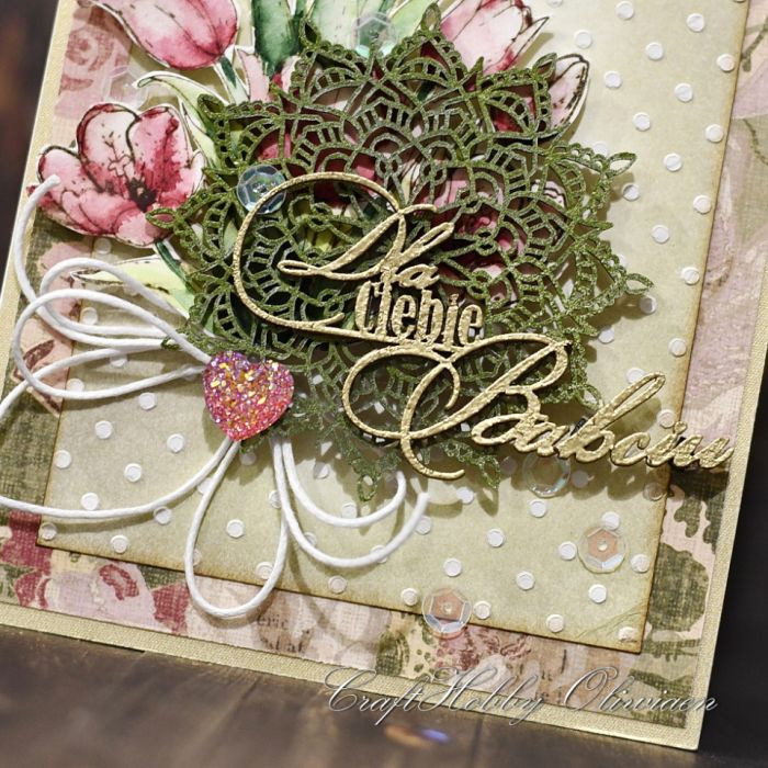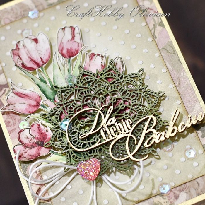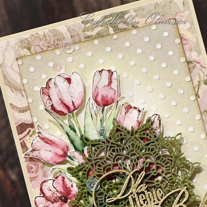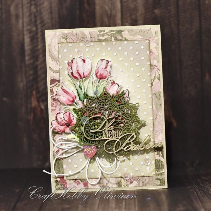 Kartka wykonana z bezkwasowych papierów do scrapbookingu, ozdobiona tłem we wzór kropeczek z pasty strukturalnej, stemplowanym i ręcznie kolorowanym motywem bukietu tulipanów, embossowanymi tekturkami beermat, kryształkowym serduszkiem, przezroczystymi cekinami i sznureczkiem.