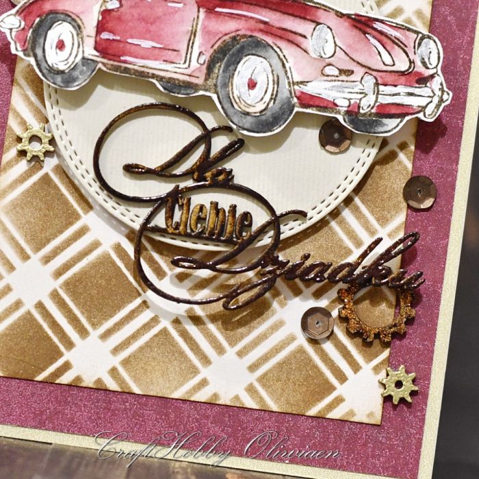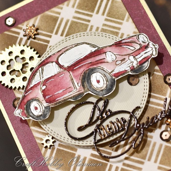 Kartka wykonana z bezkwasowych papierów do scrapbookingu, ozdobiona tłem tuszowanym we wzór kratki, embossowanymi tekturkami, stemplowanym i ręcznie kolorowanym motywem auta oraz matowymi miedzianymi cekinami.