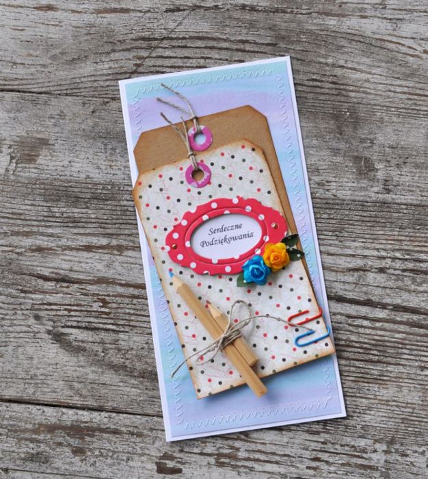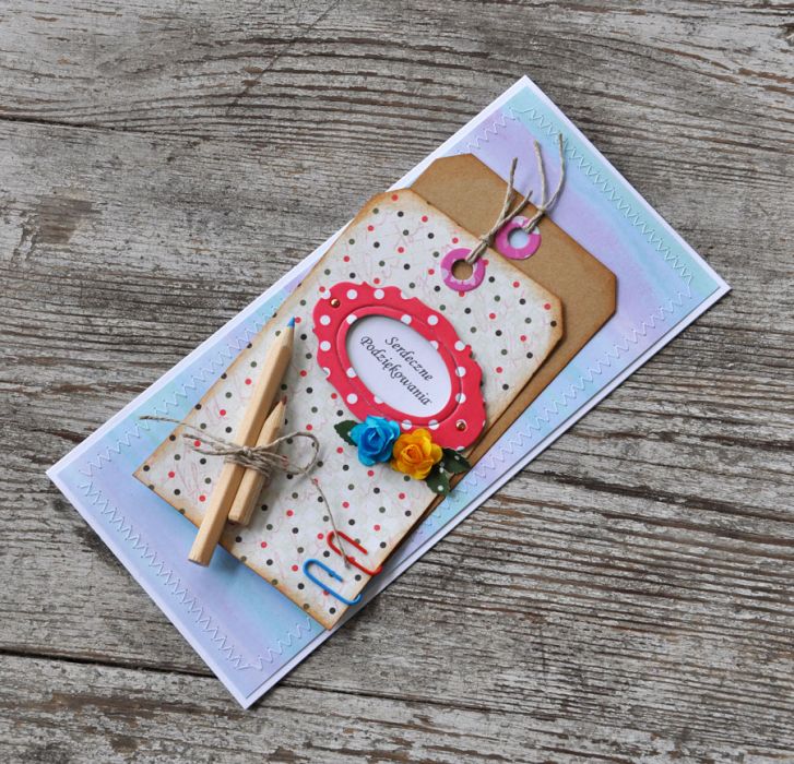 Piękna i wyjątkowa kartka okolicznościowa na podziękowania dla nauczyciela, na zakończenie roku szkolnego ; przeszywana maszynowo; rozmiar 10x21cm, w komplecie koperta; zapraszam