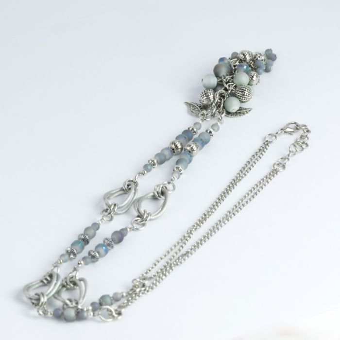 Długi, dekoracyjny naszyjnik z wisiorem typu grono, wykonany z elementów metalowych w kolorze srebrnym (metal bez niklu, kadmu i ołowiu), metalizowanych koralików akrylowych, oraz szklanych koralików star dust i szklanych kryształków. Szklane koraliki zebrane w formę grona, ozdobione nakładką w formie liści.