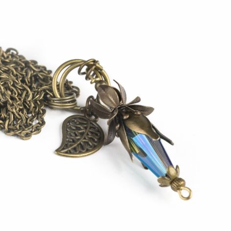 Długi naszyjnik w baśniowym stylu, wykonany z kryształka szklanego w formie kropli ( 18x8mm, kryształki mogą posiadać niewielkie rysy, wynikające z procesu produkcyjnego ) , czeskiego szkła (kulki 6mm) i elementów metalowych (metal bez niklu) w kolorze antycznego brązu.